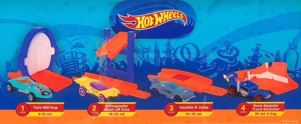 Throughout most of South East Asia and India the McDonalds Hot Wheels set for 2019 also contained four toys but with a slightly different lineup to the Australia and New Zealand release. Gt Hunter Ring Of Fire was included instead of Gazella R Jump. In 2020 the remaining toys were promoted in Singapore in July 2020 for both the Hot Wheels and Barbie sets.